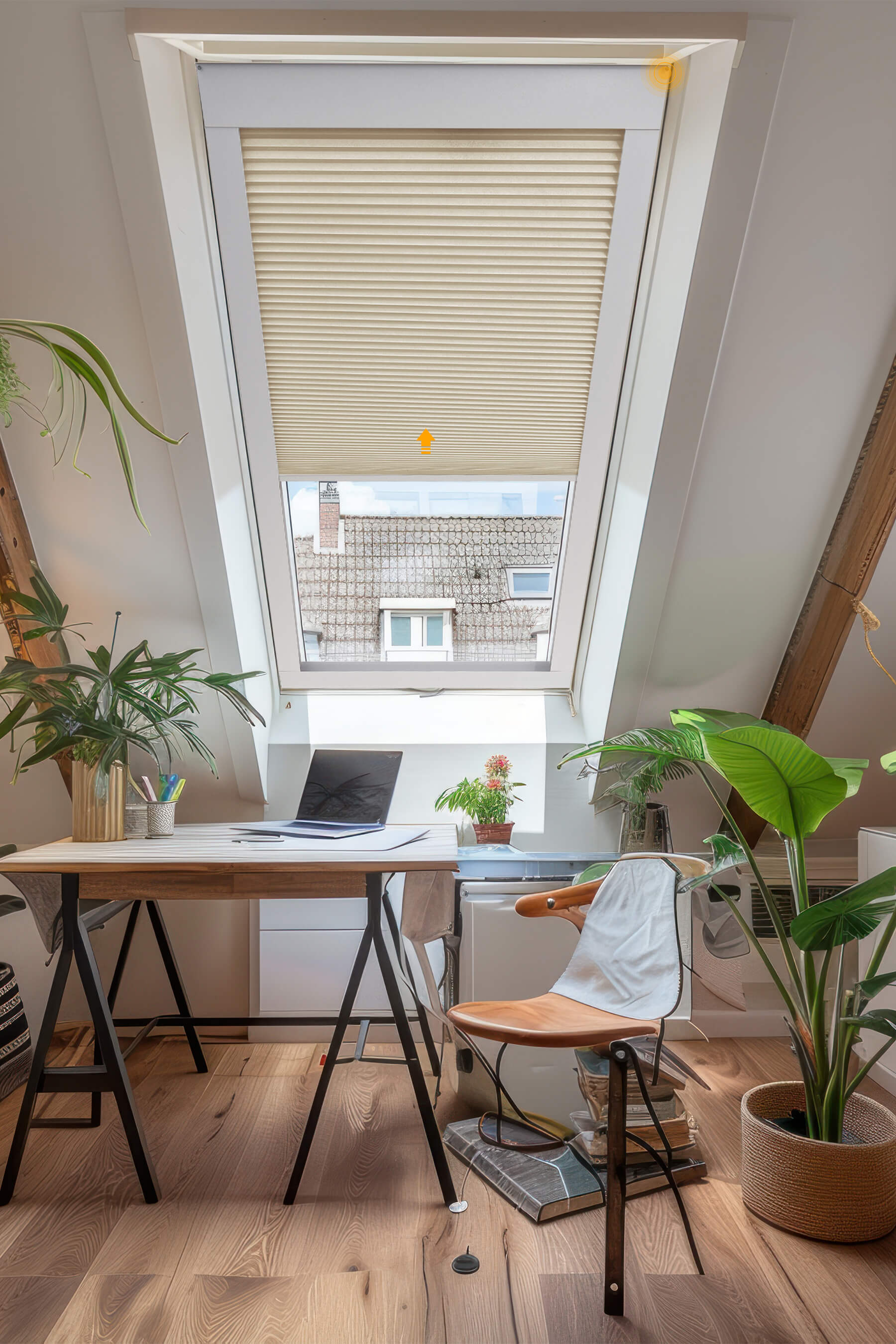 Our motorized skylight shades let you adjust light, privacy, and temperature effortlessly with a remote control. Perfect for hard-to-reach windows.