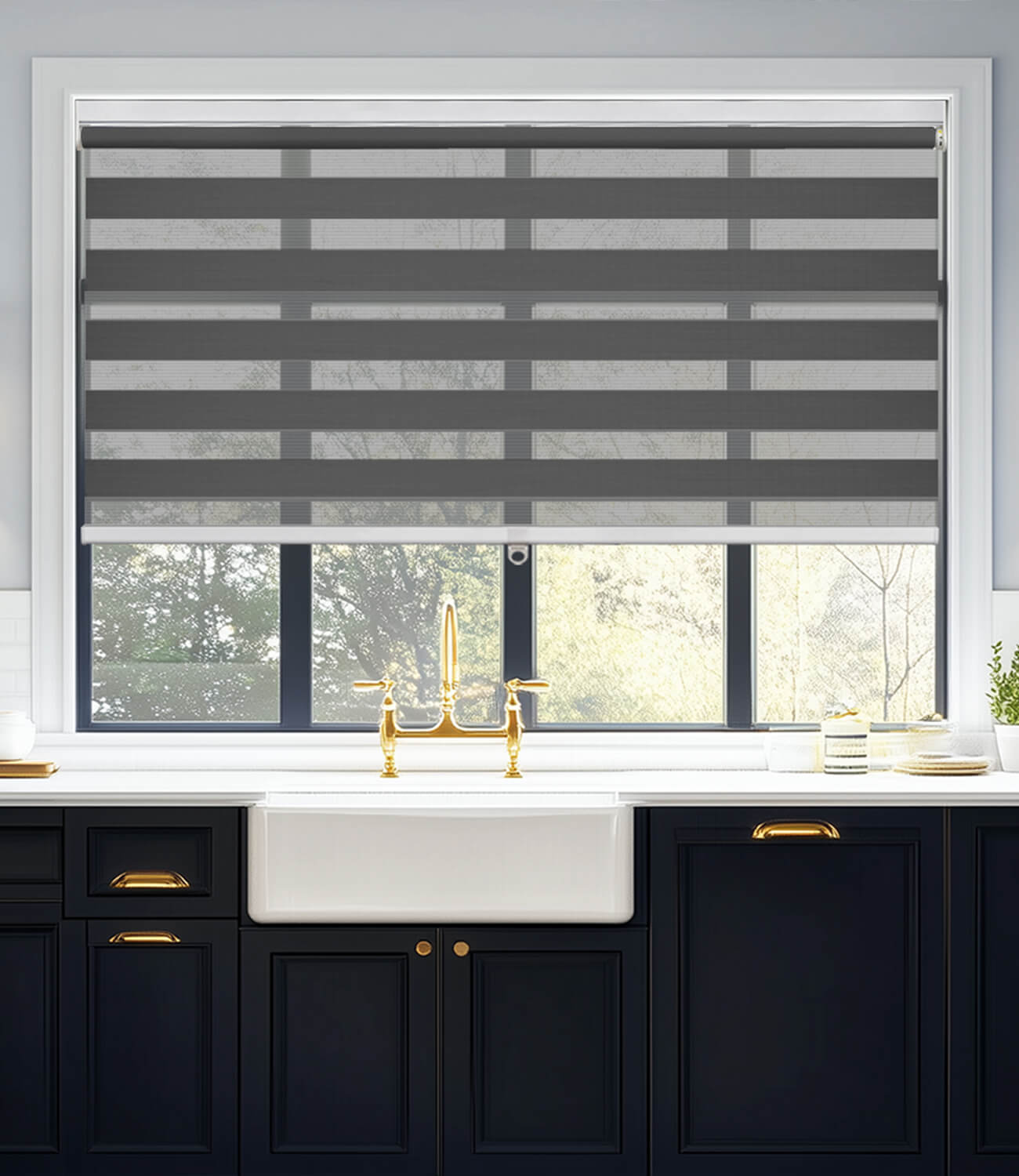 Zebra shades offer a simple way to manage light and privacy. They consist of alternating sheer and solid fabric stripes. At night, your visibility through the blinds varies based on the stripe alignment. When the solid stripes are matched up, they block light and ensure privacy, even with indoor lights turned on.