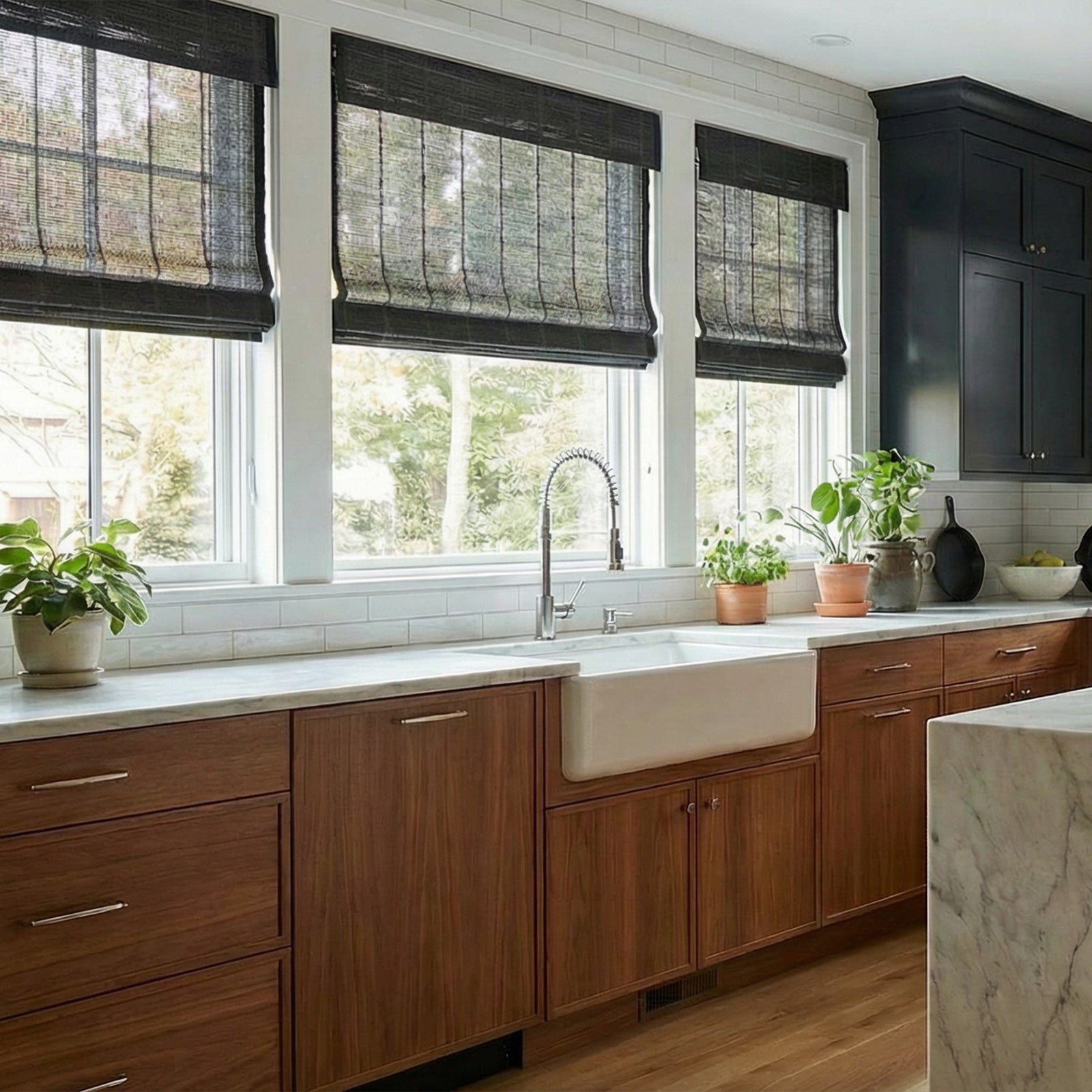 These fabrics suit living rooms, dining areas, and kitchens where you want natural light without harsh glare. They keep spaces bright and airy while providing daytime privacy.
