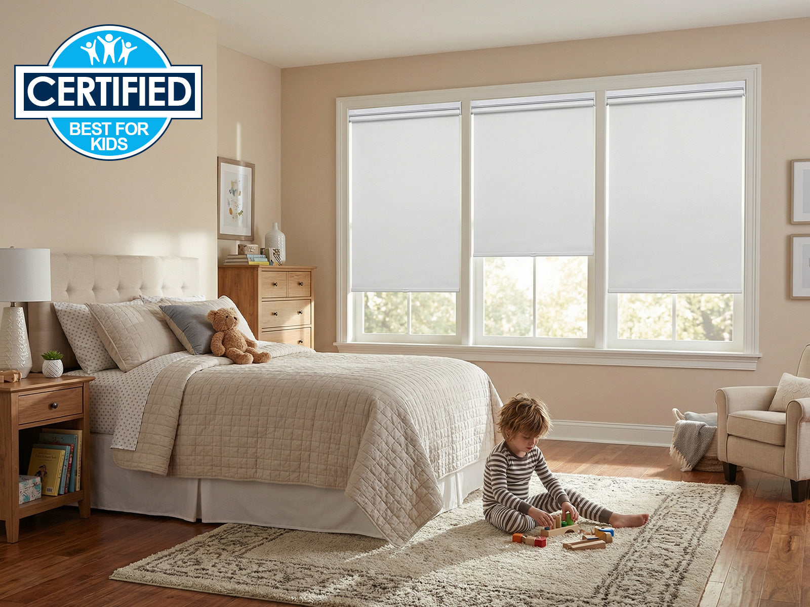 This fully cordless design meets all current U.S. ASTM child safety standards for window coverings. You effectively eliminate the serious risk of accidental cord entanglement within your home.