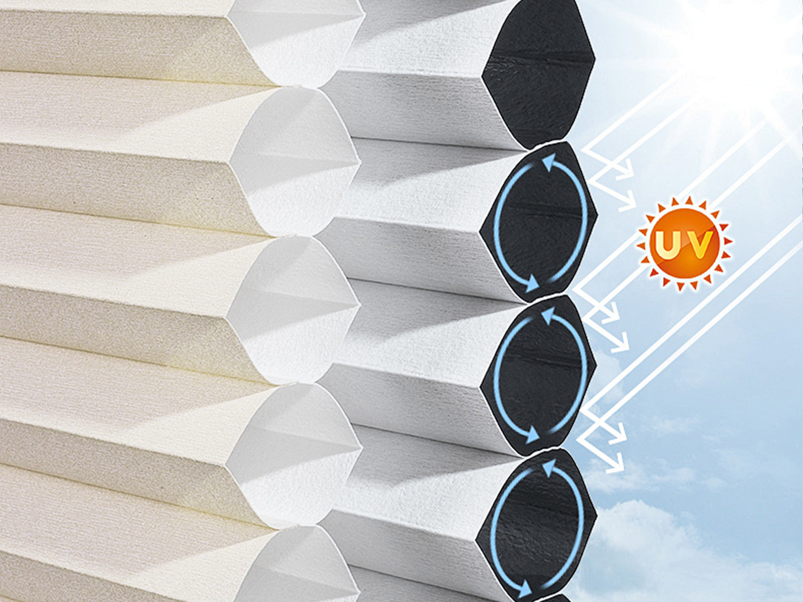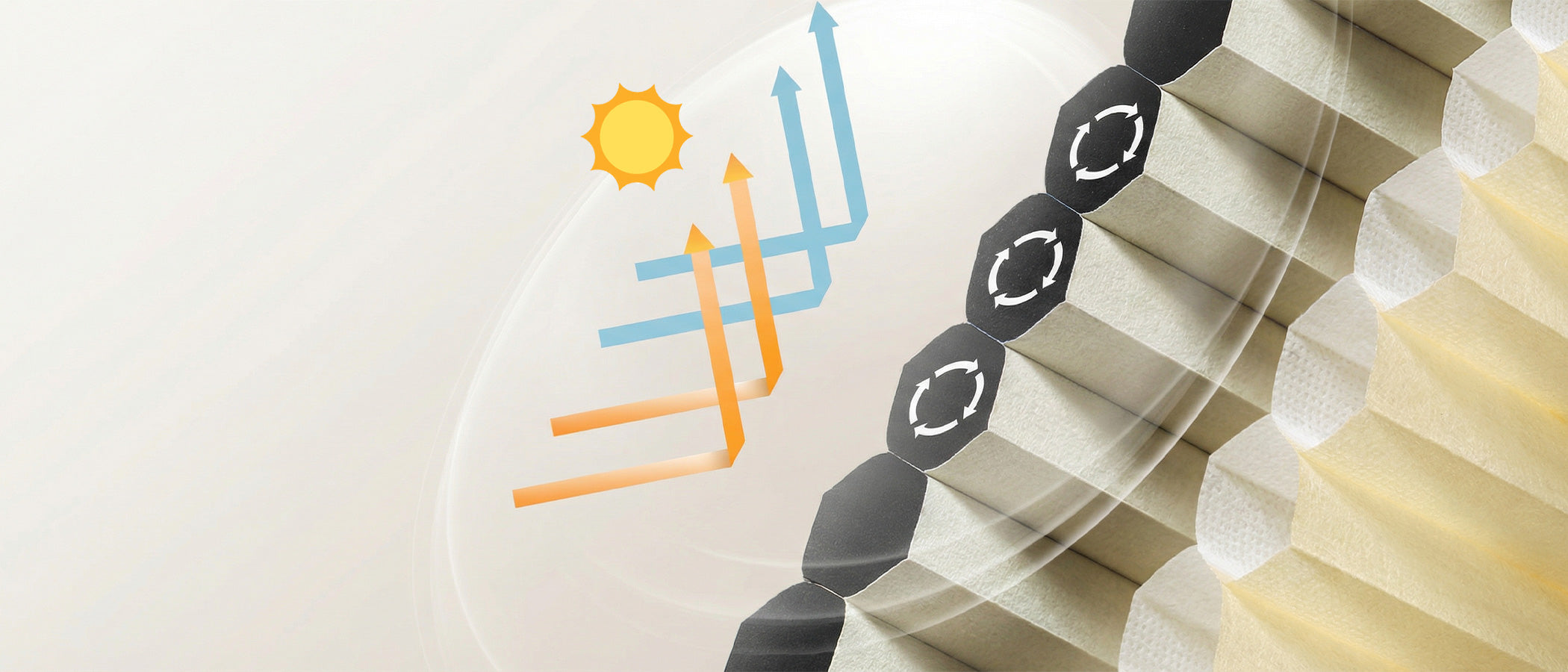Honeycomb cells trap air to reduce heat transfer and lower energy costs.